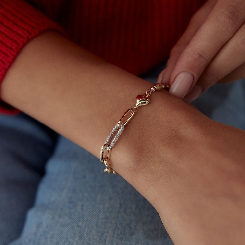 Ataç Sonsuz Kalp Tasarım Bileklik, sonsuzluk ve sevgiyi zarif şekilde yansıtıyor. İnce kalp ve ataç detayları, 14 ayar altının ışıltısıyla buluşarak anlam dolu ve sofistike bir stil yaratıyor. Kendiniz veya sevdikleriniz için özel, zamansız ve değerli bir hediye alternatifi.