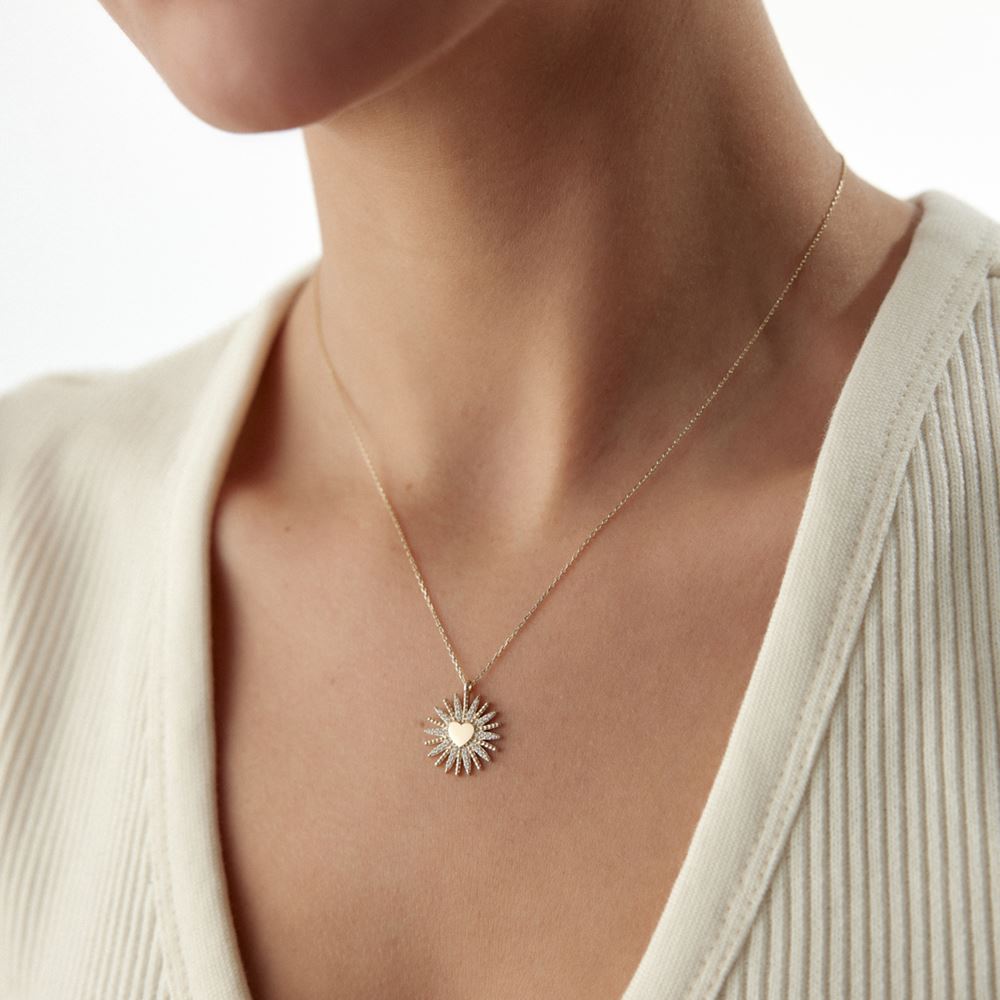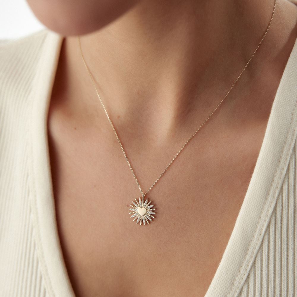 Güneş Kalp Kolye, hayatın enerjisi ve sevginin sıcaklığını bir araya getirir. 14 ayar altın işçiliğiyle hayat bulan bu zarif tasarım, güneşin parıltısı ve kalbin derin anlamını simgeliyor. Kendiniz ya da sevdikleriniz için, yaşam dolu ve anlam yüklü bir hediye arayanlara özel unutulmaz bir seçim.