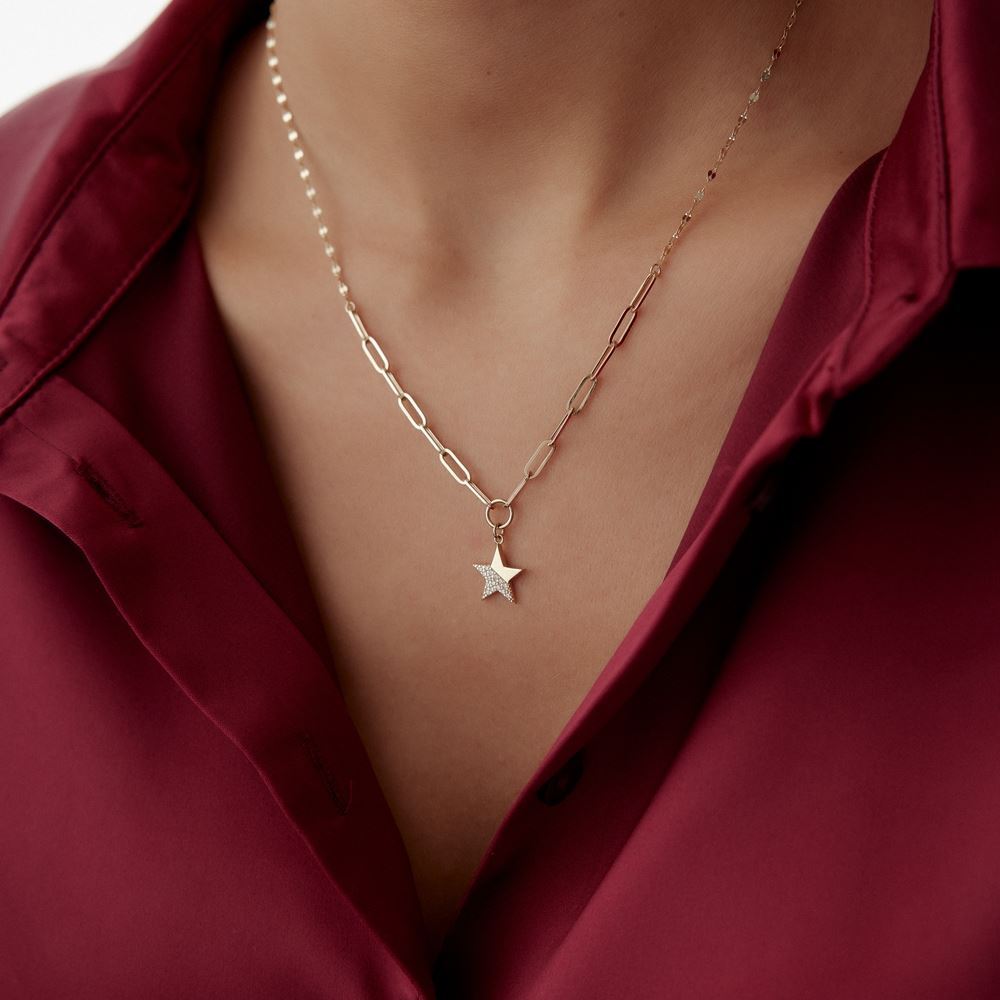 Yıldız Ataç Pullu Taşlı Kolye, umut ve ışıltıyı birlikte taşıyor. 14 ayar altının zarif işçiliği ve parlak taş detaylarıyla süslenen bu kolye, stilinize özgünlük ve anlam katıyor. Kendiniz veya sevdikleriniz için zamansız, anlam dolu ve göz alıcı bir hediye alternatifi.
